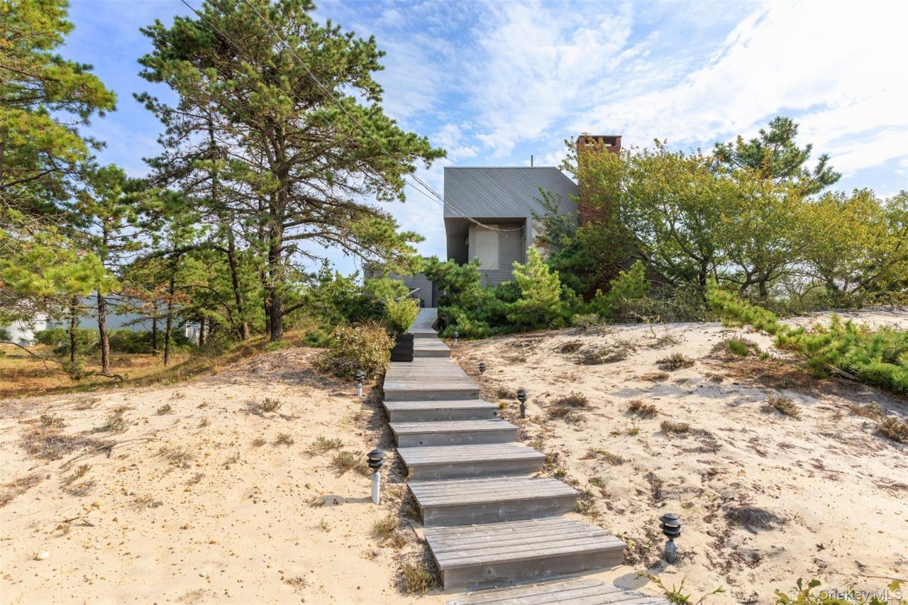 Set on 0.69 acres, bordering a two-acre dune preserve, this large 2,548 sq. ft home features four spacious bedrooms and four and a half bathrooms, including a main-floor primary suite with a private terrace. Floor-to-ceiling windows, clean lines, and an open-concept living area create a seamless indoor-outdoor flow with terraces off the living room and dining room. The chef's kitchen, outfitted with high-end appliances, opens to the dining and living room, which is anchored by a wood-burning fireplace and framed by serene views of the dune preserve . A built-in sauna on ground level offers a private space to unwind. There are 3 additional bedrooms and a family room on another level. Outside, enjoy a 20' x 40' heated pool, expansive decking, and mature landscaping-perfect for entertaining or relaxing after a day at the beach. A rooftop sundeck offers views of the ocean and dunes. With private beach access just 2 houses away, 49 Gilberts Path is a true Hamptons escape- in a highly sought-after Dunes location.